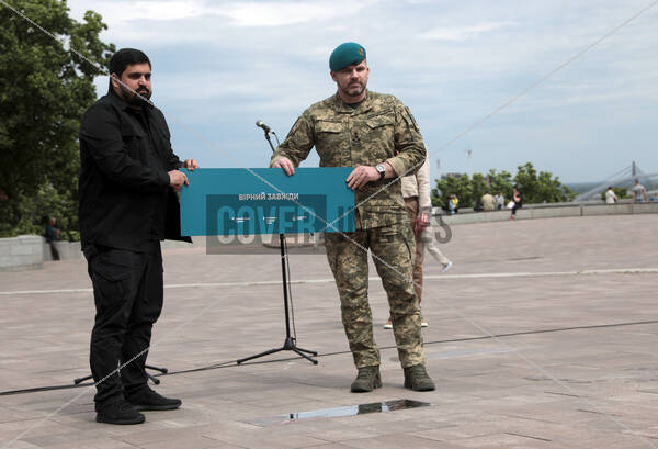 Kyiv City Military Administration head Tymur Tkachenko (L) and Chief of the General Staff of the Armed Forces of Ukraine, Major General Andrii Hnatov unveil the Marine Corps memorial sign in the square at the Arch of Freedom of the Ukrainian People