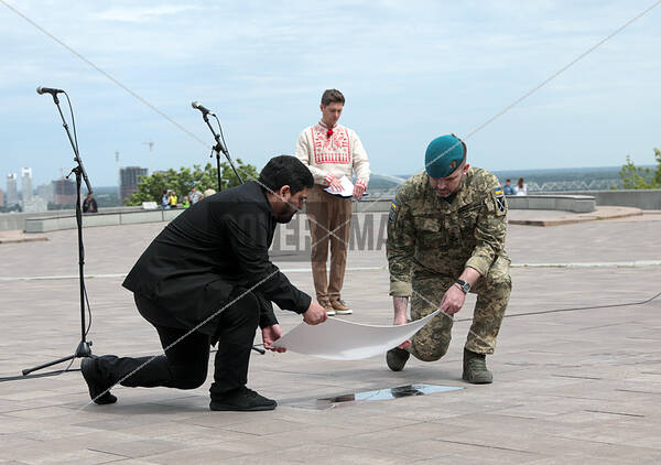 Kyiv City Military Administration head Tymur Tkachenko (L) and Chief of the General Staff of the Armed Forces of Ukraine, Major General Andrii Hnatov unveil the Marine Corps memorial sign in the square at the Arch of Freedom of the Ukrainian People