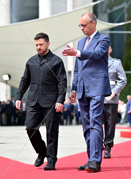 Volodymyr Zelenskyy (l), President of Ukraine, is greeted with military honors by German Chancellor Friedrich Merz (CDU) in front of the Federal Chancellery. Ukrainian President Selenskyj is on a one-day visit to the German capital.