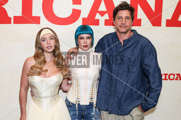 PersonInImage: American actress and producer Sydney Sweeney and American singer, songwriter, and actress Halsey (Ashley Nicolette Frangipane) wearing Dilara Findikoglu, American actor, rapper, composer, and producer Simon Rex