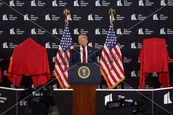United States President Donald J Trump makes remarks at an event at the John F. Kennedy Center for the Performing Arts, Washington, DC, USA, 13 August 2025. President Trump unveiled the 48th annual Kennedy Center Honors recipients: country music star George Strait, actor-singer Michael Crawford, “Rocky” actor Sylvester Stallone, singer Gloria Gaynor, and the rock band Kiss.
