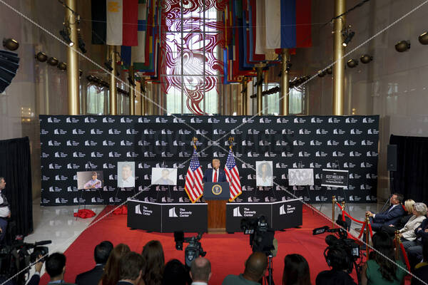 United States President Donald J Trump makes remarks at an event at the John F. Kennedy Center for the Performing Arts, Washington, DC, USA, 13 August 2025.President Trump unveiled the 48th annual Kennedy Center Honors recipients, who’s portraits are displayed behind him: country music star George Strait, actor-singer Michael Crawford, “Rocky” actor Sylvester Stallone, singer Gloria Gaynor, and the rock band Kiss.
