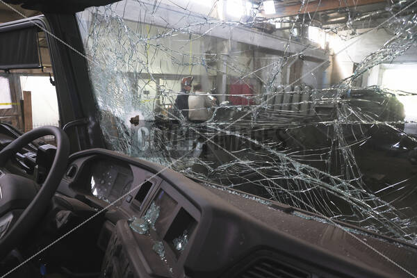 A hole is in the windscreen of a military truck in the hangar, where the repair teams of the 5th Skif Separate Slobozhanska Brigade of Ukraine’s National Guard restore damaged military vehicles