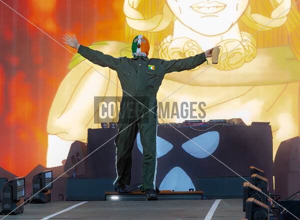 Kneecap perform live at Wythenshawe Park in Manchester, UK, on August 15, 2025. The Belfast-based Irish hip hop trio brought their politically charged lyrics and high-energy performance to the Manchester crowd.