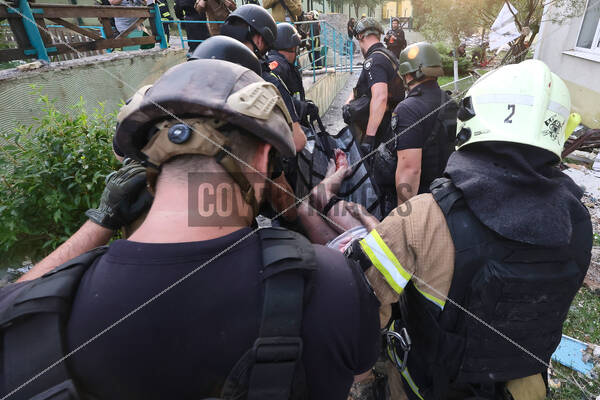 Rescuers carry a man on a stretcher to an ambulance after he was injured in a Russian drone strike on a multi-story residential building, Kharkiv, Ukraine, on August 18, 2025