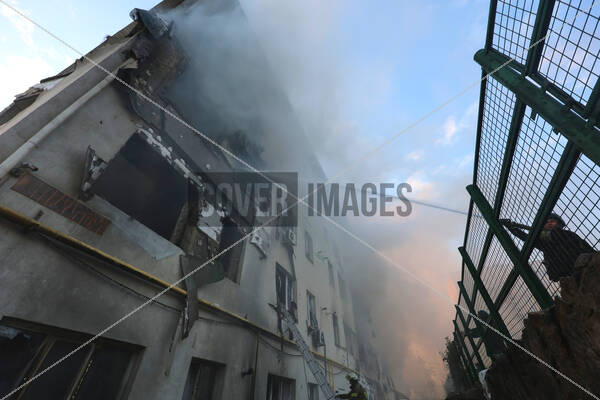 Firefighters extinguish a fire caused by a Russian drone strike in one of the apartments of a multi-story residential building, Kharkiv, Ukraine, on August 18, 2025