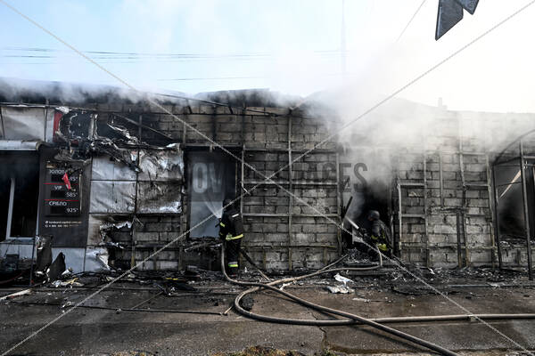 Keywords: Russian-Ukrainian war,Russian aggression,war in Ukraine,war,shelling,aftermath,destruction,SES,firefighters,rescuers,elimination,consequences,drone attack,drone strike,market pavilions,response effort,fire,smoke