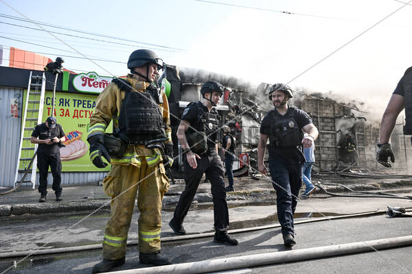 Keywords: Russian-Ukrainian war,Russian aggression,war in Ukraine,war,shelling,aftermath,destruction,SES,firefighters,rescuers,elimination,consequences,drone attack,drone strike,market pavilions,police,response effort