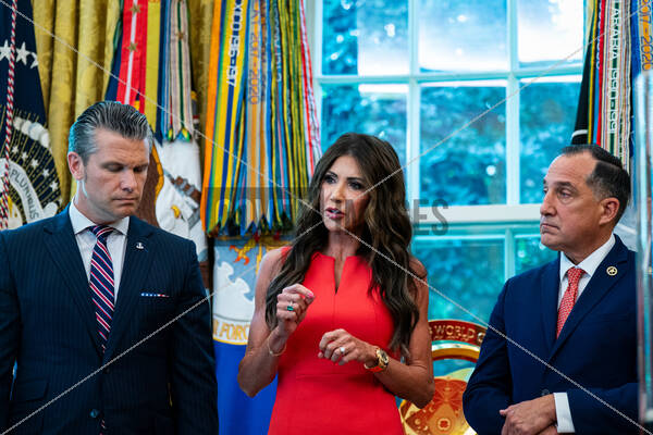 PersonInImage: Pete Hegseth, US secretary of defense, from left, Kristi Noem, secretary of the US Department of Homeland Security (DHS), and Gadyaces Serralta, director of the US Marshals Service