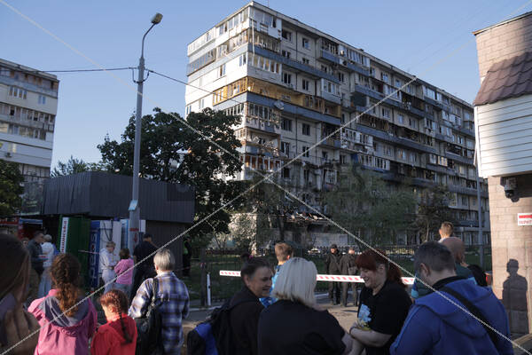 Keywords: loitering munition attack,Dniprovskyi district,Berezniaky,damage,multi-story residential building,shattered glass,broken windows,Russian-Ukrainian war,Russian aggression,war in Ukraine,war,shelling,missile attack,aftermath,destruction,missile strike