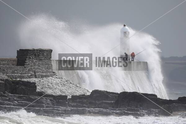 Fishermen brave the stormy sea as large wave crashes over them. The remanence of tropical storm Fernand hits the UK as gusty winds increase during high tide at Porthcawl, Wales, with large waves reaching over the breakwater.