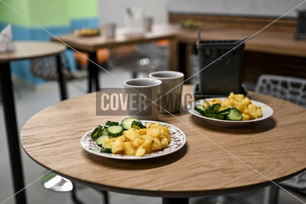 Keywords: Ukraine conflict,Russian invasion,Ukraine war,war,conflict,Russia-Ukraine war,childhood,education,school,underground,front line,Balabyne,Zaporizhzhia region,food,breakfast,plate,mug,table,canteen
