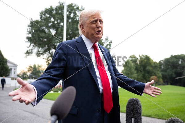United States President Donald J Trump speaks to reporters on the South Lawn of the White House in Washington, DC, USA, prior to boarding Marine One to fly to deliver remarks to an unusual gathering of senior military leaders at the Marine Base in Quantico, Virginia on September 30, 2025.