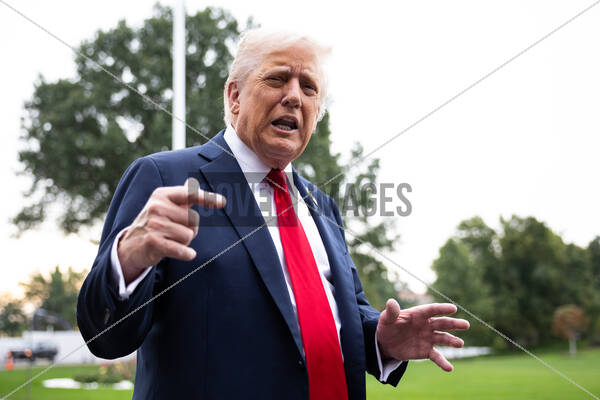 United States President Donald J Trump speaks to reporters on the South Lawn of the White House in Washington, DC, USA, prior to boarding Marine One to fly to deliver remarks to an unusual gathering of senior military leaders at the Marine Base in Quantico, Virginia on September 30, 2025.