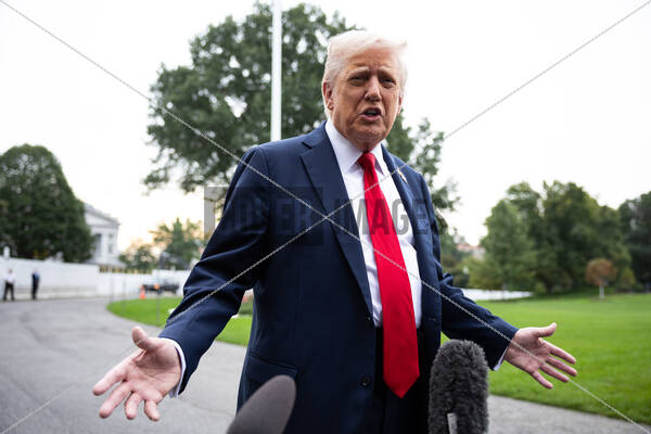 United States President Donald J Trump speaks to reporters on the South Lawn of the White House in Washington, DC, USA, prior to boarding Marine One to fly to deliver remarks to an unusual gathering of senior military leaders at the Marine Base in Quantico, Virginia on September 30, 2025.