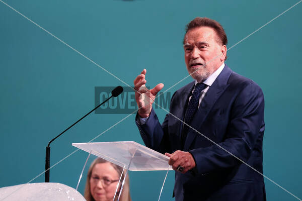 Arnold Schwarzenegger speaks before the Pontiff. Pope Leo XIV participates in the International Conference "Raising Hope for Climate Justice" – Tenth Anniversary, promoted by the Laudato Si Movement at the Mariapolis Center in Castelgandolfo