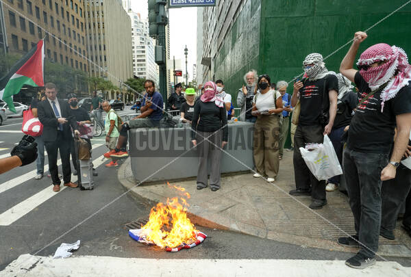 Pro Palestinian Protestors burn the American Flag and protest against Israel on the anniversary of October 7 at the corner of Second Avenue and East 42nd Street