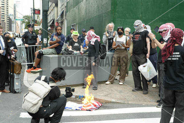 Pro Palestinian Protestors burn the American Flag and protest against Israel on the anniversary of October 7 at the corner of Second Avenue and East 42nd Street