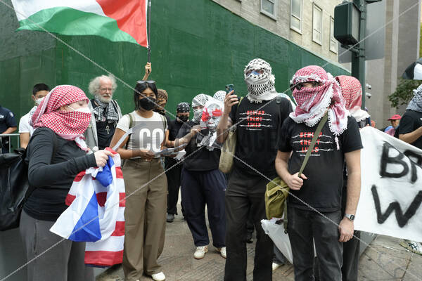 Pro Palestinian Protestors burn the American Flag and protest against Israel on the anniversary of October 7 at the corner of Second Avenue and East 42nd Street