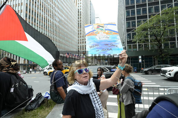 Pro Palestinian Protestors burn the American Flag and protest against Israel on the anniversary of October 7 at the corner of Second Avenue and East 42nd Street