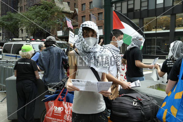 Pro Palestinian Protestors burn the American Flag and protest against Israel on the anniversary of October 7 at the corner of Second Avenue and East 42nd Street