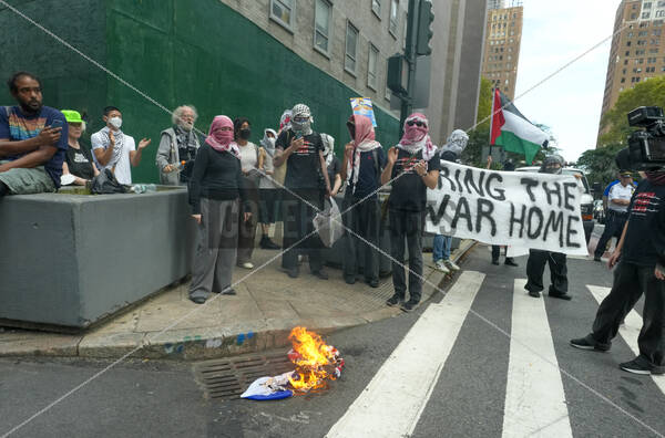 Pro Palestinian Protestors burn the American Flag and protest against Israel on the anniversary of October 7 at the corner of Second Avenue and East 42nd Street