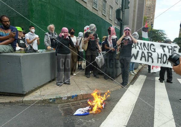 Pro Palestinian Protestors burn the American Flag and protest against Israel on the anniversary of October 7 at the corner of Second Avenue and East 42nd Street