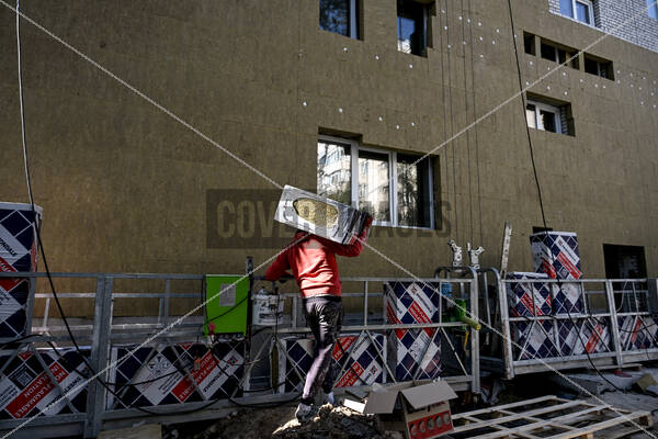 Keywords: Ukraine conflict,Russian invasion,Ukraine war,war,conflict,Russia-Ukraine war,construction,apartment block,reconstruction,Zaporizhzhia,suspended scaffold,mineral wool,insulation