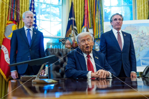 United States President Donald J Trump gives remarks with United States Secretary of Energy Chris Wright and United States Secretary of the Interior and Chair, National Energy Council and White House Energy Czar Doug Burgum looking on, after President Trump signed an executive order regarding Alaskan mining in the Oval Office of the White House in Washington, DC, USA, on Monday, October 6, 2025.