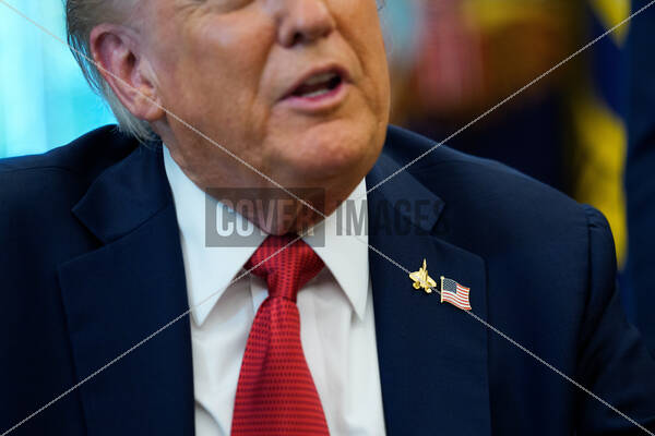 United States President Donald J Trump wears a fighter jet lapel pin during an executive order signing event regarding Alaskan mining in the Oval Office of the White House in Washington, DC, USA, on Monday, October 6, 2025.