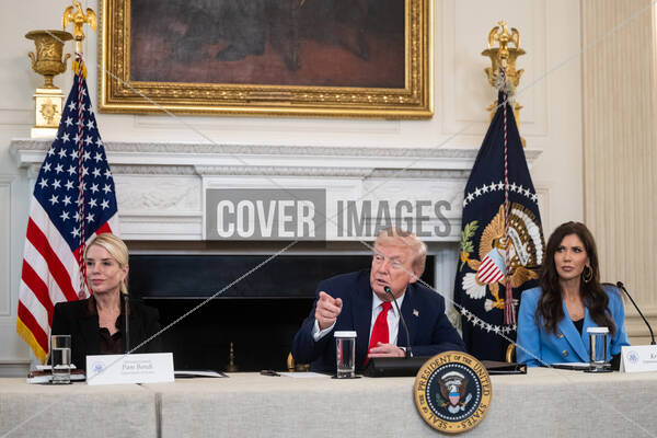 United States President Donald J Trump, flanked by US Attorney General Pam Bondi, left, and US Secretary of Homeland Security (DHS) Kristi Noem, speaks during a roundtable on antifa in the State Dining Room of the White House in Washington, DC, USA