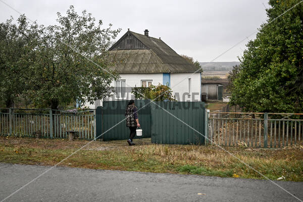 Keywords: Ukraine conflict,Russian invasion,Ukraine war,war,conflict,Russia-Ukraine war,Dobropillia,Zaporizhzhia region,woman,fence,house,bucket,coutryside