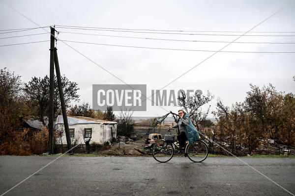 Keywords: Ukraine conflict,Russian invasion,Ukraine war,war,conflict,Russia-Ukraine war,Dobropillia,Zaporizhzhia region,countryside,woman,house,ruin,road,bicycle