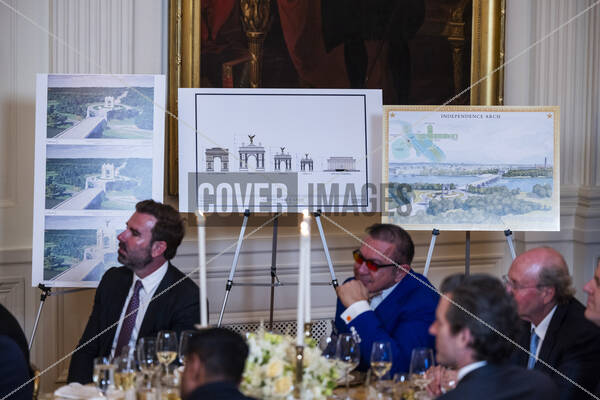Artist diagrams of the planned Triumph Arch are seen at a dinner with US President Donald Trump to raise money for his ballroom extension in the East Room of the White House in Washington, DC, USA, 15 October 2025. The 90,000-square-foot ballroom expansion of the White House will seat an estimated 900 people and is estimated to cost $250 million US dollars.