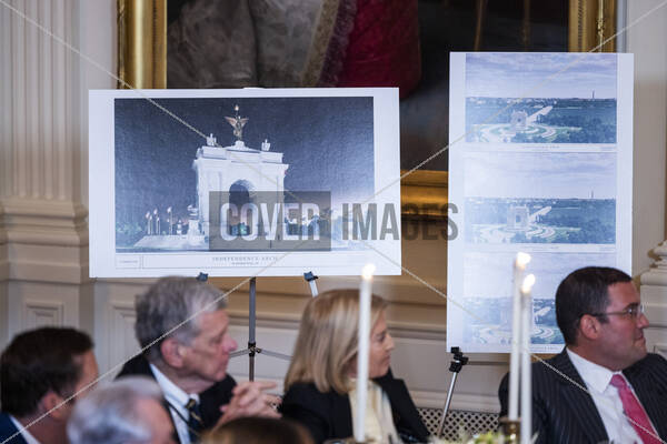 Artist diagrams of the planned Triumph Arch are seen at a dinner with United States President Donald J Trump to raise money for his ballroom extension in the East Room of the White House in Washington, DC, USA, 15 October 2025. The 90,000-square-foot ballroom expansion of the White House will seat an estimated 900 people and is estimated to cost $250 million US dollars.