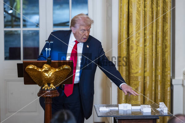United States President Donald J Trump gestures toward some models as he speaks ahead of a dinner to raise money for his ballroom extension in the East Room of the White House in Washington, DC, USA, 15 October 2025. The 90,000-square-foot ballroom expansion of the White House will seat an estimated 900 people and is estimated to cost $250 million US dollars.