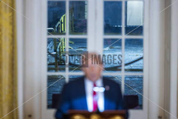 Construction on the ballroom extension of the White House is seen behind United States President Donald J Trump as he speaks at a dinner to raise money for the ballroom in the East Room of the White House in Washington, DC, USA, 15 October 2025. The 90,000-square-foot ballroom expansion of the White House will seat an estimated 900 people and is estimated to cost $250 million US dollars.