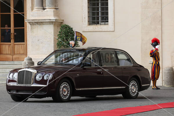 Arrival of British royals King Charles III with Queen Camilla in the Cortile San Damaso to meet Pope Leo XIV