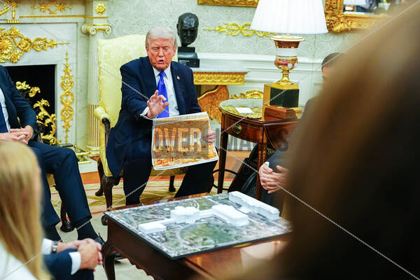 United States President Donald J Trump shows an interior rendering of the new White House Ballroom as he meets Mark Rutte, Secretary General of the North Atlantic Treaty Organization (NATO) in the Oval Office of the White House in Washington, DC, USA, on Wednesday, October 22, 2025. The leaders are meeting to discuss continuing support for Ukraine.