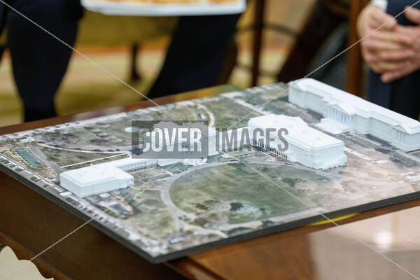 A mockup of the White House with the White House ballroom renovation is seen in the Oval Office in Washington, DC, USA, on Wednesday, October 22, 2025.