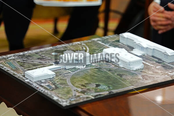 Model of the White House with the new ballroom on the table as United States President Donald J Trump meets Mark Rutte, Secretary General of the North Atlantic Treaty Organization (NATO) in the Oval Office of the White House in Washington, DC, USA, on Wednesday, October 22, 2025. The leaders are meeting to discuss continuing support for Ukraine.