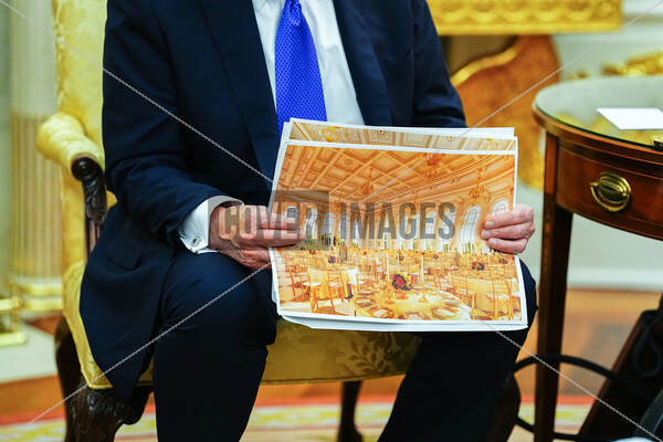 United States President Donald J Trump shows an interior rendering of the new White House Ballroom as he meets Mark Rutte, Secretary General of the North Atlantic Treaty Organization (NATO) in the Oval Office of the White House in Washington, DC, USA, on Wednesday, October 22, 2025. The leaders are meeting to discuss continuing support for Ukraine.