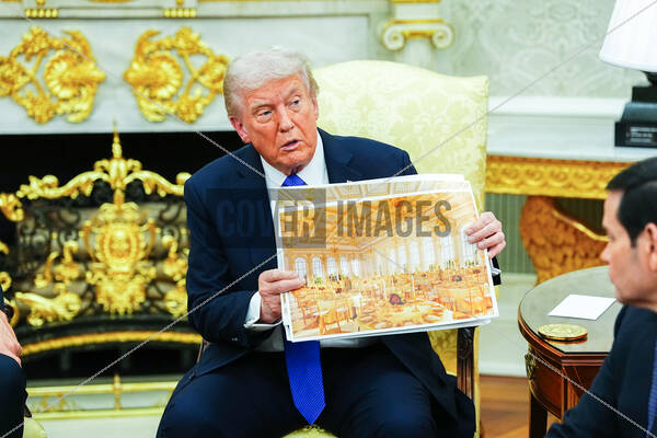 United States President Donald J Trump shows an interior rendering of the new White House Ballroom as he meets Mark Rutte, Secretary General of the North Atlantic Treaty Organization (NATO) in the Oval Office of the White House in Washington, DC, USA, on Wednesday, October 22, 2025. The leaders are meeting to discuss continuing support for Ukraine.