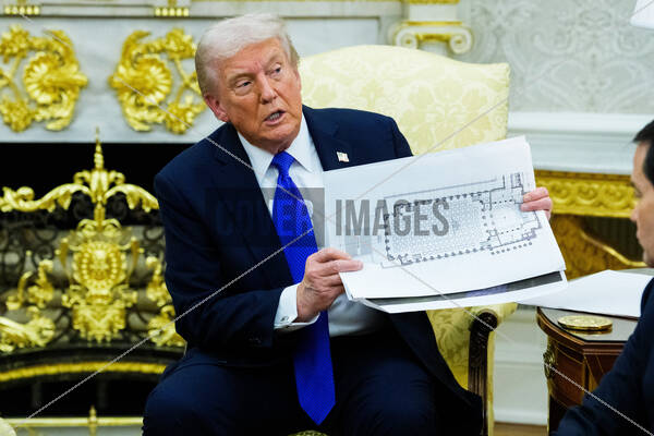 United States President Donald J Trump holds a mockup of the White House ballroom, as he meets Mark Rutte, Secretary General of the North Atlantic Treaty Organization (NATO) in the Oval Office of the White House in Washington, DC, USA, on Wednesday, October 22, 2025. The leaders are meeting to discuss continuing support for Ukraine.
