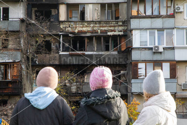 Keywords: Ukraine conflict,Russian invasion,Ukraine war,war,conflict,Russia-Ukraine war,aftermath,emergency,drone attack,Desnianskyi district,Kyiv,apartment block,woman,people,onlooker