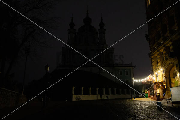 Keywords: Ukraine conflict,Russian invasion,Ukraine war,war,conflict,Russia-Ukraine war,energy,electricity,power supply,power cut,power outage,rolling blackout,blackout,Kyiv,evening,twilight,dusk,night,dark,light,St Andrew’s Church,string lights,architecture,church