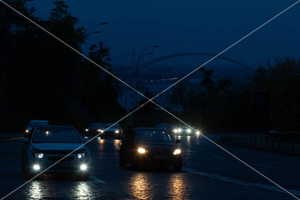 Keywords: Ukraine conflict,Russian invasion,Ukraine war,war,conflict,Russia-Ukraine war,energy,electricity,power supply,power cut,power outage,rolling blackout,blackout,Kyiv,evening,twilight,dusk,night,dark,light,Volodymyrskyi Descent,street,car,transport,headlight,traffic,congestion,bridge,Podilskyi Bridge Crossing,Pivnichnyi Bridge