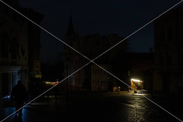 Keywords: Ukraine conflict,Russian invasion,Ukraine war,war,conflict,Russia-Ukraine war,energy,electricity,power supply,power cut,power outage,rolling blackout,blackout,Kyiv,evening,twilight,dusk,night,dark,light,street,Andriivskyi Descent,man,pedestrian,string lights