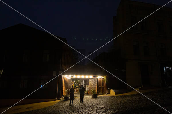 Keywords: Ukraine conflict,Russian invasion,Ukraine war,war,conflict,Russia-Ukraine war,energy,electricity,power supply,power cut,power outage,rolling blackout,blackout,Kyiv,evening,twilight,dusk,night,dark,light,restaurant,cobblestone,Andriivskyi Descent,people,street