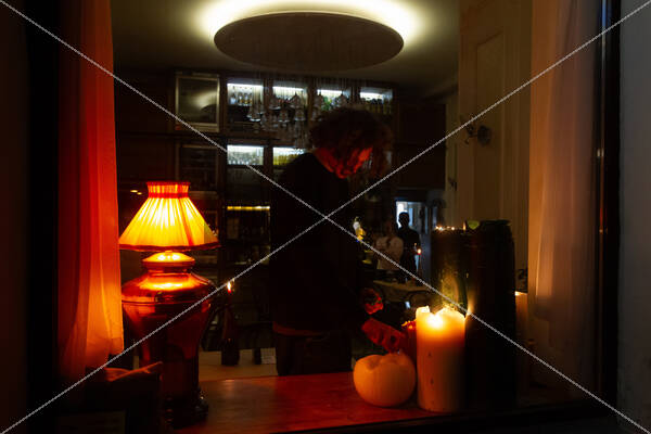Keywords: Ukraine conflict,Russian invasion,Ukraine war,war,conflict,Russia-Ukraine war,energy,electricity,power supply,power cut,power outage,rolling blackout,blackout,Kyiv,evening,twilight,dusk,night,dark,light,cafe,candle,man